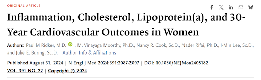 [3] P. M. Ridker, M. V. Moorthy, N. R. Cook, N. Rifai, I.-M. Lee, and J. E. Buring, ‘Inflammation, Cholesterol, Lipoprotein(a), and 30-Year Cardiovascular Outcomes in Women’, N. Engl. J. Med., vol. 391, no. 22, pp. 2087–2097, Dec. 2024, doi: 10.1056/NEJMoa2405182.