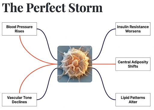It is also a vascular and metabolic transition, with changes in blood pressure, adiposity (weight change), cholesterol, insulin sensitivity, and blood vessel function that can make the usual cardiovascular risk models look more reassuring [2].