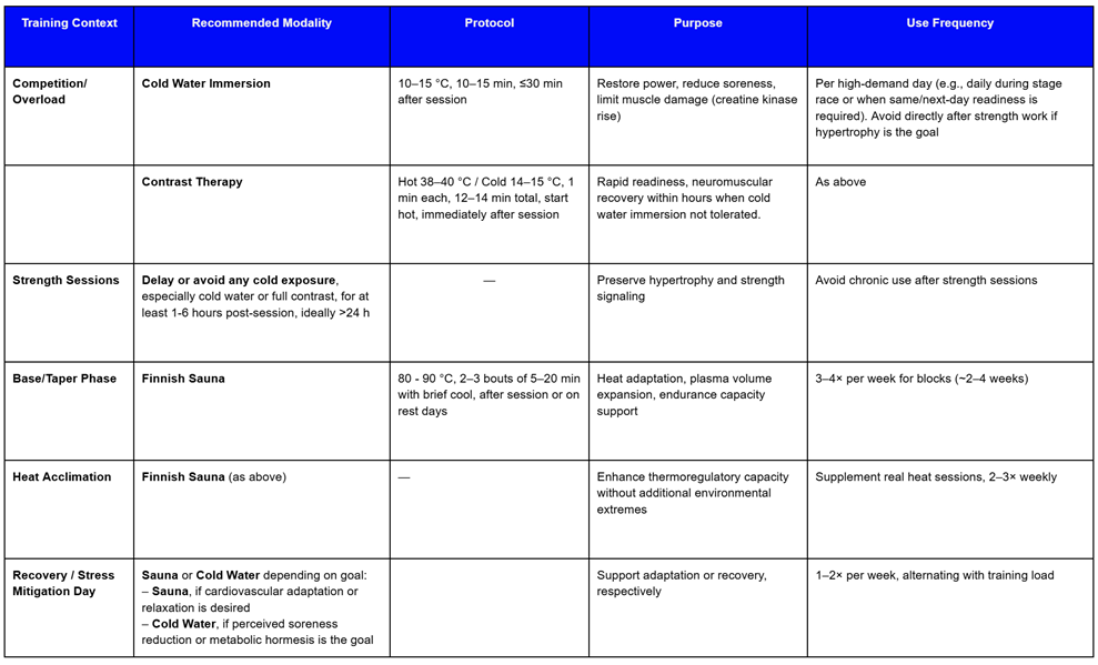 The bottom-line-up-front is that hot, cold, and contrast therapies can meaningfully improve short-term recovery, reduce muscle soreness, and in some cases enhance endurance and cardiovascular function. The benefits are, however, highly context-dependent: cold water can preserve next-day power in competition or overload weeks, but frequent post-resistance use may blunt strength and hypertrophy gains. Sauna can support vascular function, endurance, and improve cardiovascular health, with emerging evidence for mental health benefits. Contrast therapy may speed readiness when full cold is not tolerated, though evidence is limited. Timing these interventions within the training cycle, matching them to specific recovery or adaptation goals, and respecting individual cardiovascular and health risks are key to implementing these effectively.