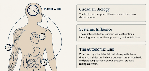 When our eating schedule falls out of step with these rhythms, the balance between the sympathetic and parasympathetic nervous systems can shift. That provides a plausible link between late meals and cardiovascular strain, but direct causal evidence in humans is limited.