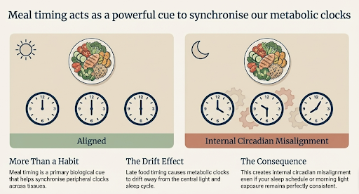 Meal timing is not just a behavioural marker. It is one of the cues that helps synchronise peripheral clocks across tissues [3]. Food timing can cause metabolic clocks to drift away from the light and sleep cycle, creating internal circadian misalignment even when sleep or morning light exposure is consistent.
