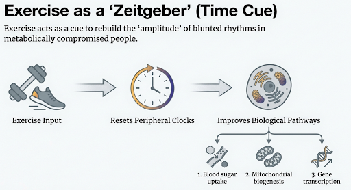 In health, those pathways oscillate across the day, optimising fuel use and repair processes. In metabolic disease, however, the amplitude of those rhythms is blunted. Appropriately timed exercise may provide a “zeitgeber” signal (natural phenomenon which acts as a cue in the regulation of the body's circadian rhythms) to rebuild that amplitude, but much of this evidence comes from animal models, not people. We should therefore treat it as plausibility rather than prescription.