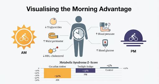 Both exercise groups improved body composition, waist circumference and cardiorespiratory fitness compared with controls, losing about 0.7 % body fat and 2 cm off the waist. However, morning training produced greater reductions in cardiometabolic markers: systolic blood pressure fell by about 4 % versus 1 % in the afternoon group, fasting insulin dropped by 12 % versus 5 %, and insulin resistance (HOMA‑IR) declined by 14 % versus 4 %. The compound metabolic syndrome “Z” score decreased by roughly half in the morning group and by about a fifth in the afternoon group. These differences may be partly explained by meal timing and composition: the afternoon group exercised after a larger meal, which may blunt fat utilisation and postmeal insulin response. Still, this trial suggests that morning high‑intensity training may offer additional benefits for blood pressure and insulin sensitivity in people with metabolic syndrome.