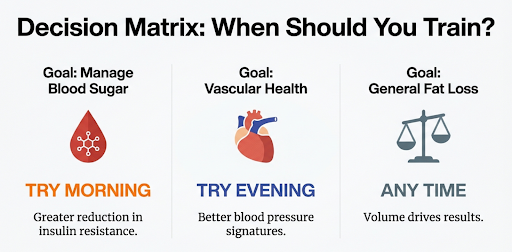 Q: Does morning exercise really improve metabolic health more than afternoon exercise?A: Evidence is mixed and population‑specific. In a sixteen‑week trial of adults with metabolic syndrome, both morning and afternoon high‑intensity interval sessions improved body composition and fitness, but morning training reduced systolic blood pressure and insulin resistance more. In contrast, a twelve‑week study in sedentary men found that evening exercise offered greater vascular benefits. These differences are modest and may be influenced by factors like meal timing.
