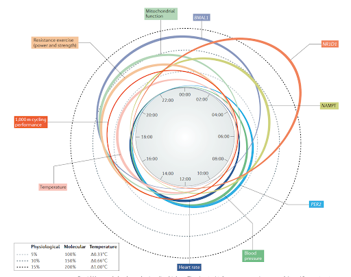 A recent review explored how daily rhythms and exercise interact [1]. It argues that disrupted timing of activity, nutrition and sleep may exacerbate insulin resistance and obesity. In particular, skeletal muscle mitochondria appear more active in the late afternoon, and that clock function may be blunted in the muscles of people with metabolic disease.
