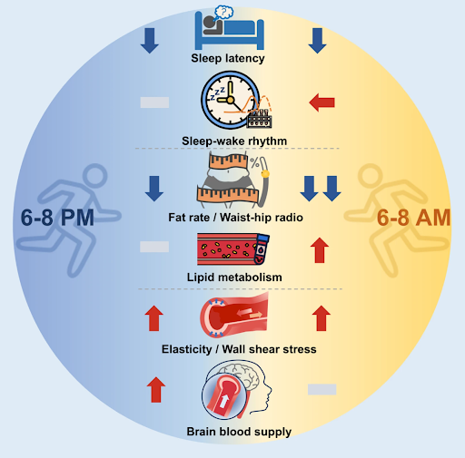 Fig: Benefits of a morning or evening 12-week aerobic exercise programme on sleep and cardiometabolic health. Source: [3].