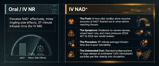 A 2024 randomised trial directly comparing IV NAD⁺ against intravenous NR in healthy adults found that IV NAD⁺ caused moderate-to-severe nausea, raised heart rate, and chest pressure, while IV NR produced only minor tingling and raised NAD⁺ levels more effectively [15]. A 2026 real-world review confirmed the same pattern [16].