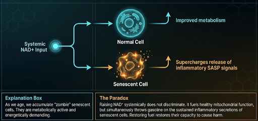 This creates a problem for NAD⁺ supplementation that is not widely acknowledged. Raising NAD⁺ levels systemically does not selectively target healthy cells. It raises NAD⁺ availability throughout the body, including in senescent cells, which then have more fuel to sustain and amplify their inflammatory secretions.