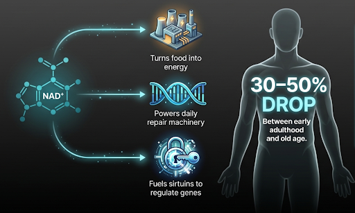 The result is an estimated 30–50% fall in NAD⁺ levels between early adulthood and old age [4].