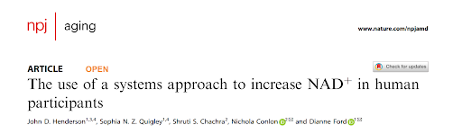 [13] J. D. Henderson, S. N. Z. Quigley, S. S. Chachra, N. Conlon, and D. Ford, ‘The use of a systems approach to increase NAD+ in human participants’, Npj Aging, vol. 10, no. 1, p. 7, Feb. 2024, doi: 10.1038/s41514-023-00134-0.