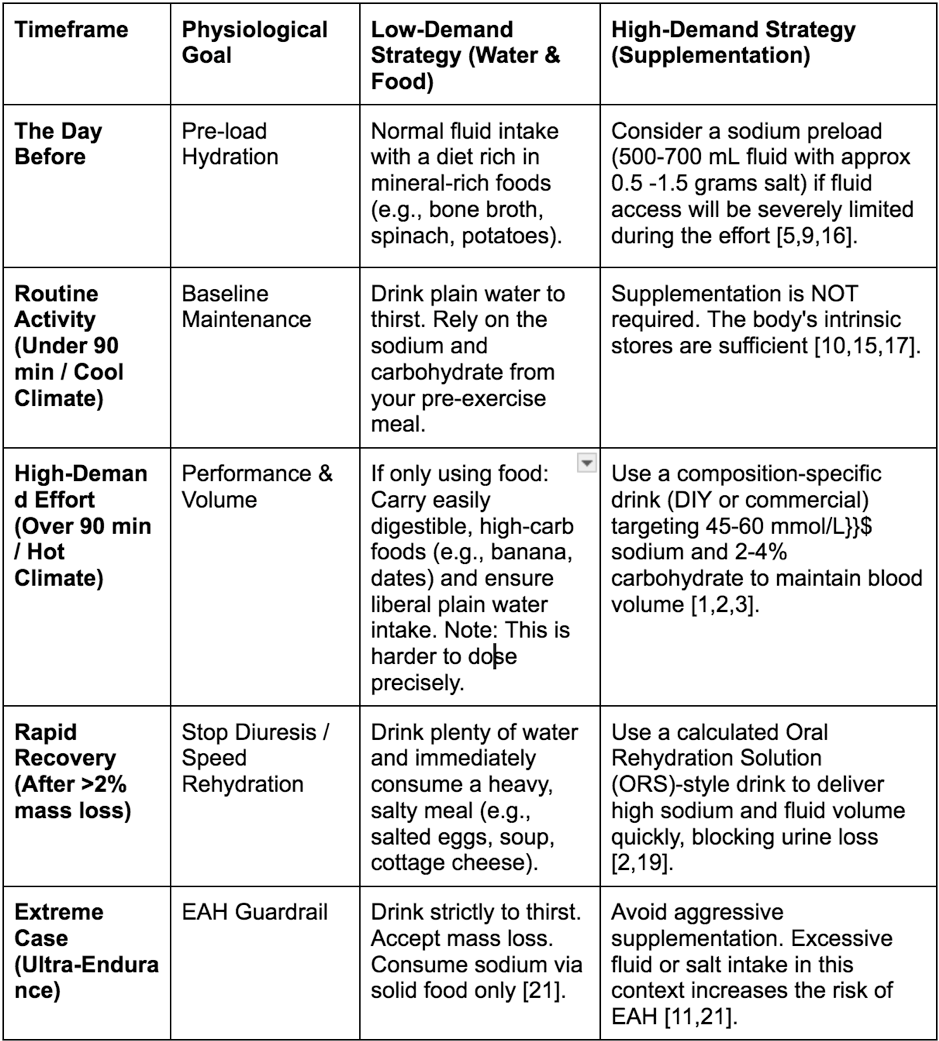 When Supplementation Becomes Necessary (The Threshold): High-sodium/high-electrolyte drinks are only physiologically necessary when the rate of fluid and salt loss is too high to be safely replaced by just water and a single meal. This typically involves scenarios where both large volume and performance are at risk (e.g., prolonged endurance, intense heat exposure, rapid rehydration, or extreme/extended sauna/hot yoga sessions).